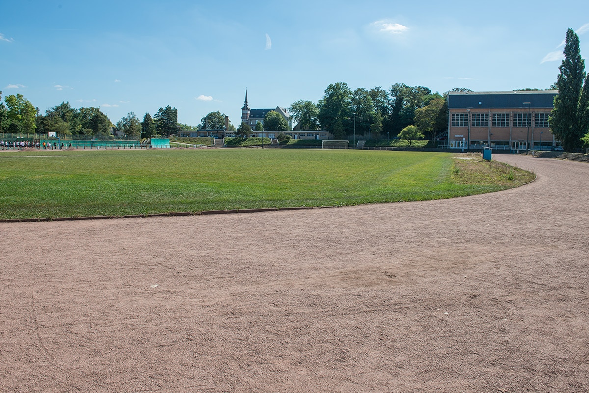 Avec en avant plan la piste et derrière le Hall Omnisports