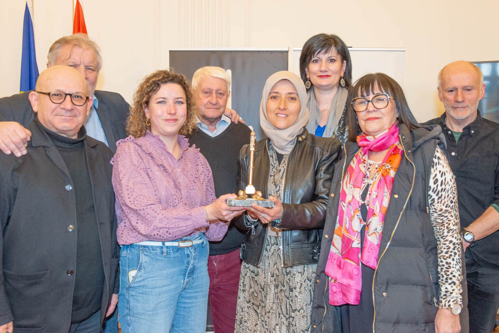 Elle reçoit le Perron d’Or des mains de Mme Sarah Schlitz, Secrétaire d’État à l’Egalité des genres, à l’Egalité des chances et à la Diversité, adjointe au ministre de la Mobilité