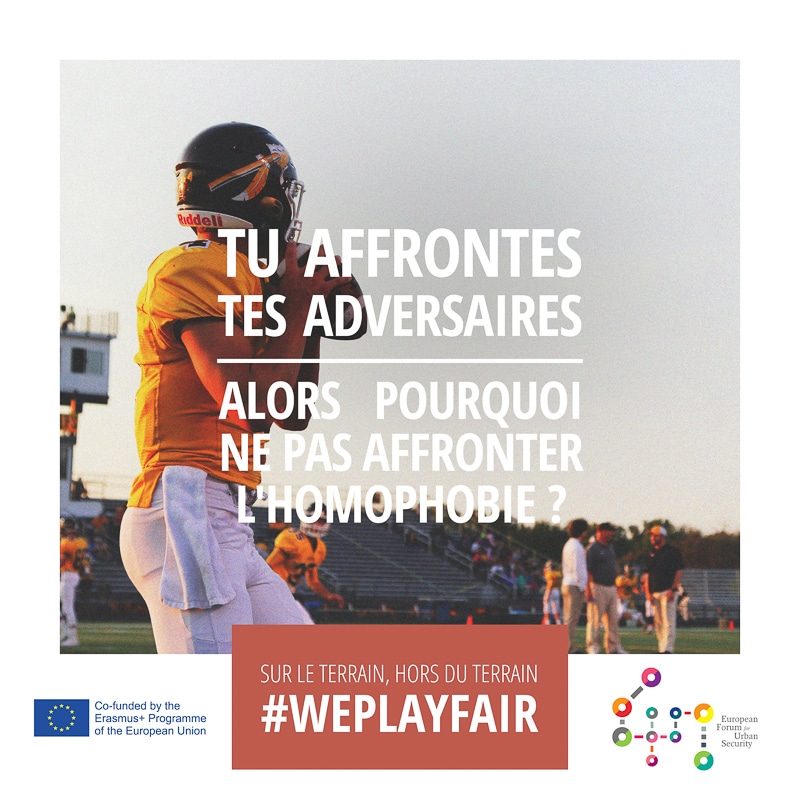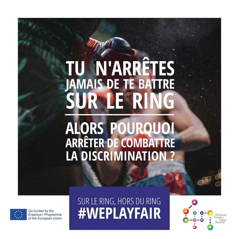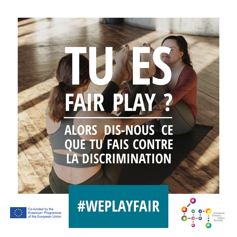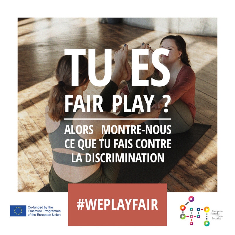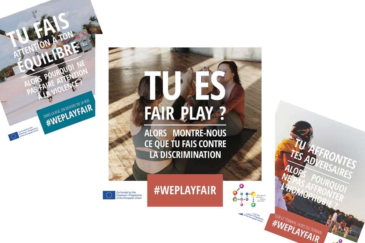 #weplayfair comprend une série d’affiches et a pour objectif la sensibilisation aux questions de discrimination et de violence dans le sport, ainsi que la valorisation des actions menées dans le cadre du projet. La campagne s’adresse principalement aux acteurs de terrain – professionnels du sport, clubs amateurs, associations anti-discrimination – mais aussi au grand public et aux autorités locales.